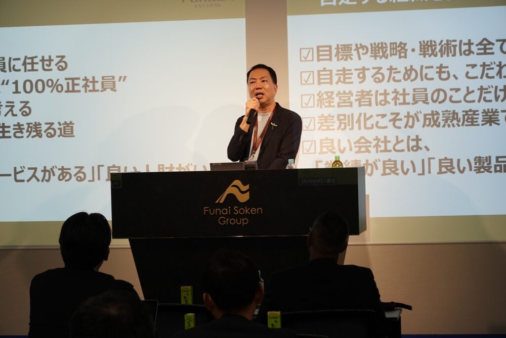 船井総合研究所(コンサル業界唯一の上場企業)の「経営者合宿(二日間)」にて、講演をさせていただきました。総勢300人。講演者は吉野家、一休、グリーンエナジー、等。業界トップの錚々たる顔ぶれです。場所は東京駅前のブルガリホテルがあるミッドタウン八重洲。35階にある本社の豪華な空間と眺めには息をのみました。家賃は年8億円とか。福田刃物工業の2025年経常利益を少し超える。講演前、吉野家の名誉会長・安部修仁氏にご挨拶に行きました。「いつか安部さんに会いたいと思っていて夢が叶いました」「そうでしたか。光栄ですな。福田さんところは1896年創業。吉野家は1899年だから3年負けましたな(笑)」初めて会う、しかも尊敬する著名人に福田刃物工業の創業年を言われて、胸が熱くなりました。吉野家の倒産から再上場、牛肉BSE問題による牛丼以外のメニュー開発、そして牛丼280円戦略とすべて彼が関わっています。この牛丼280円については真相が聞けて本当に良かった。安部氏の感動の講演のあと、とうとう私の番がやってきました。300人の前で冒頭に出た言葉は「私、福田克則は経営者に向いていない」。吉野家もそうですが、一休の榊社長(売上高500億円、経常利益250億円)は実力でトップに立った。グリーンエナジーの鈴江社長は創業者で、たった10年で100億円の上場企業にした。一方、自分は実力ではなく、福田家の長男として生まれたから社長になれた。能力ではなく100%運で社長になった。「福田刃物工業は2034年に100億円企業になります」とみんなの前で言っちゃいました。いつもの勢いで。安部さん、榊さん、鈴江さんという真の実力経営者に接して、あらためて思ったのです。自分も人生一度はがんばらなあかん。勉強になった、ためになった、で自分をごまかしたくない。刺激が半端ない2日間でした。