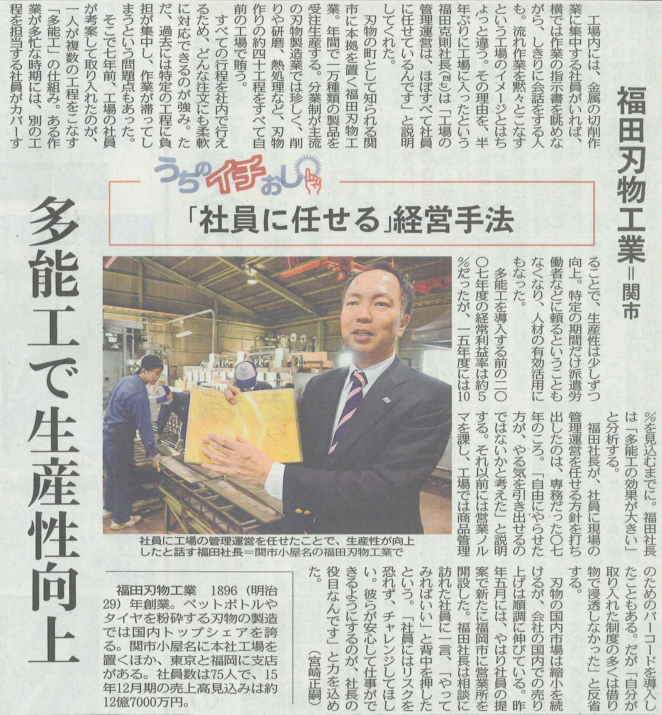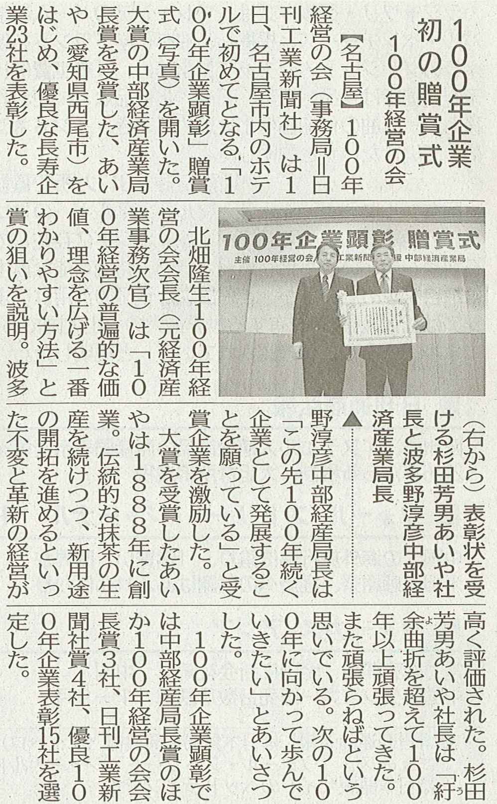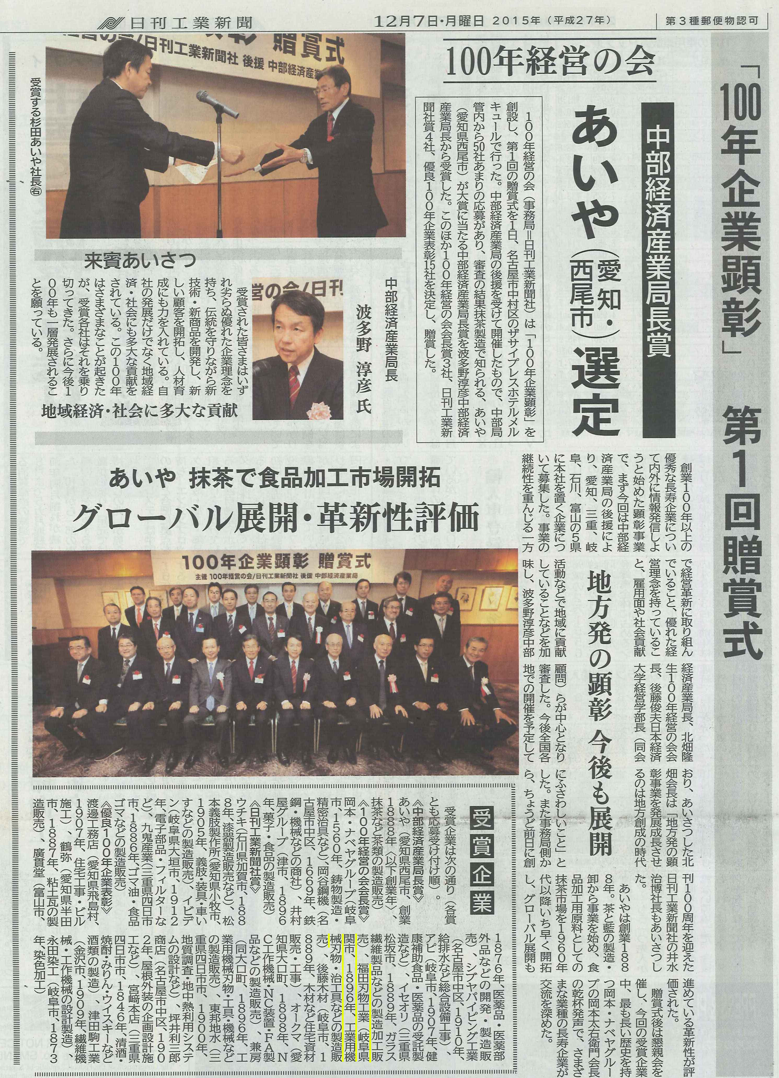 12月7日の日刊工業新聞に、100年企業顕彰の特集があり、弊社の記事が載りました。