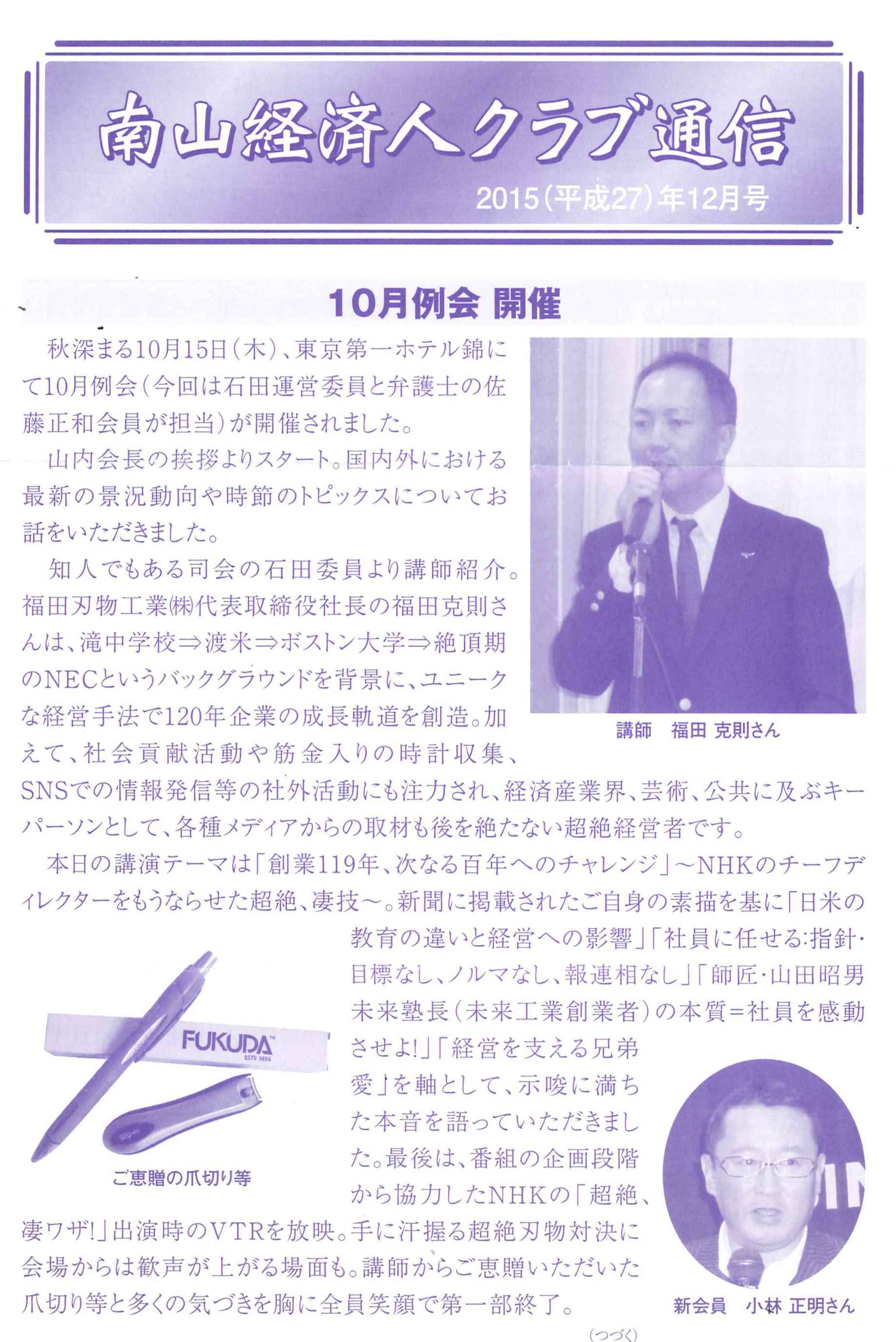 2015年12月号の南山経済人クラブ通信にて10月例会の様子が掲載されました。