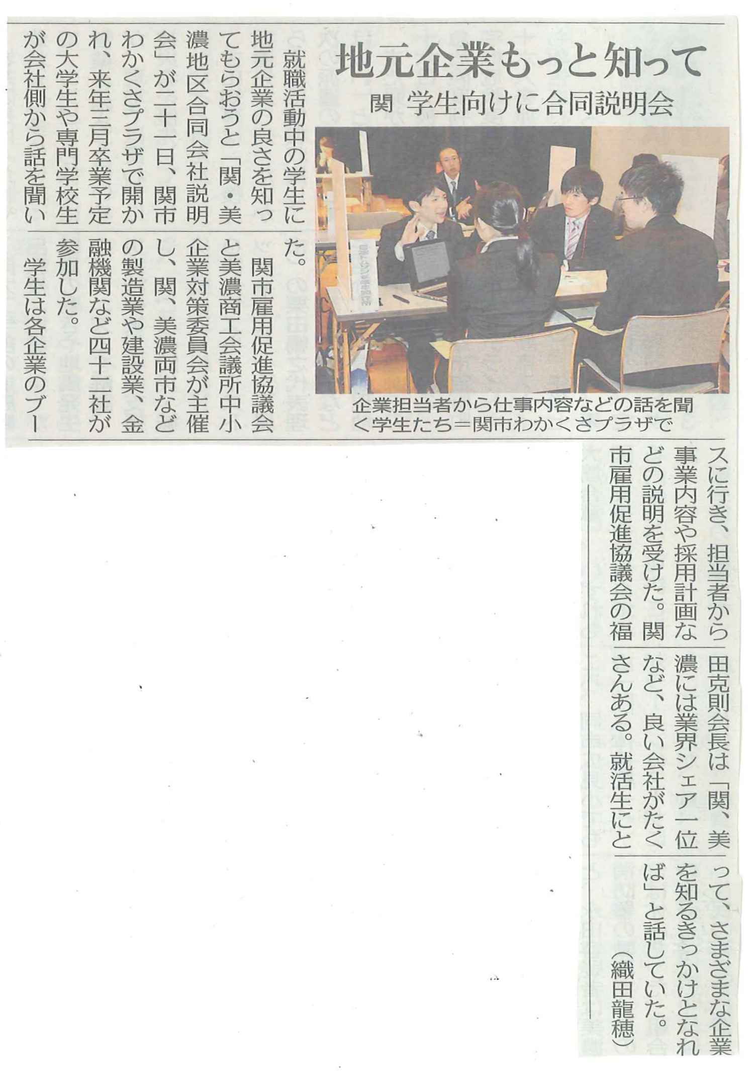 昨日の関・美濃地区合同会社説明会の様子が、今朝の中日新聞に掲載されました。 新聞のコメントにある主催の関市雇用促進協議会会長は、当社の社長が務めています。