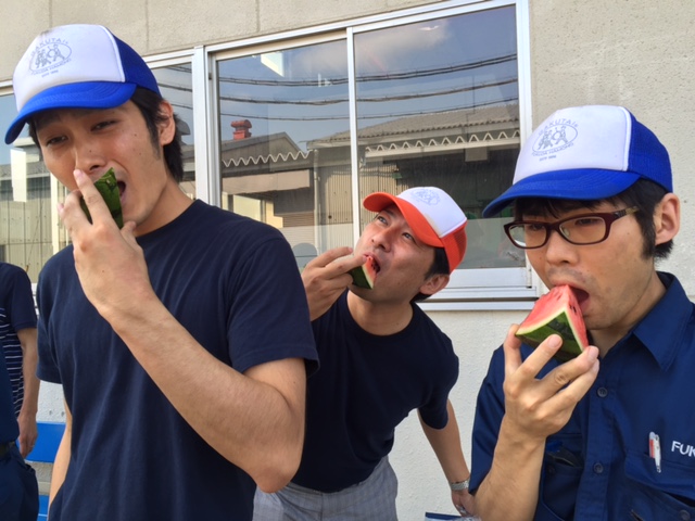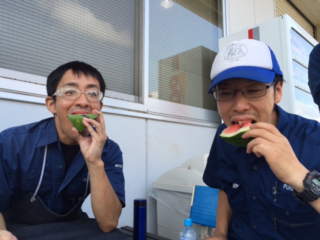 動植物部が育てたスイカが食べ頃になり、社員で3時のおやつとしておいしくいただきました。