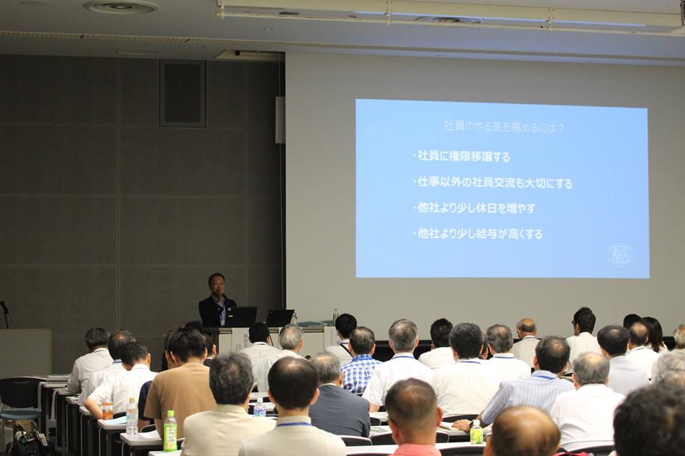 特別な戦略・戦術はありません。100%正社員と社内一貫生産を絶対条件とし、社員を軸に他社との違いだけを考える。一般常識を疑い、他社がしないことを 実行する。見方によって弱みかもしれない「強み」は一切考えない。例えば、社員の20%が営業で全国直接販売をしている会社は業界ではレア。実務は全て社 員に任せ、権限委譲していることも強調。法人企業の70%強が赤字なんだから、低迷する会社は今のやり方の真逆をやれば儲かるかもしれない。いつものよう に勝手気ままに(笑)お話ししました。