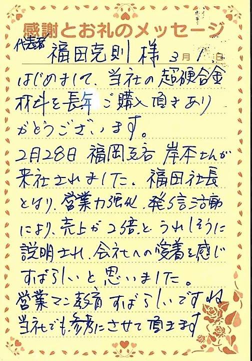 先月、ハガキが届いた。誰だろう?面識がないので最初は困惑した。とりあえず読んでみると、福岡支店3年目の若手社員について嬉しいことが書いてある。彼に聞いたら、送り主は博多に本社を構える上場企業(業界1位)の幹部だそうだ。…