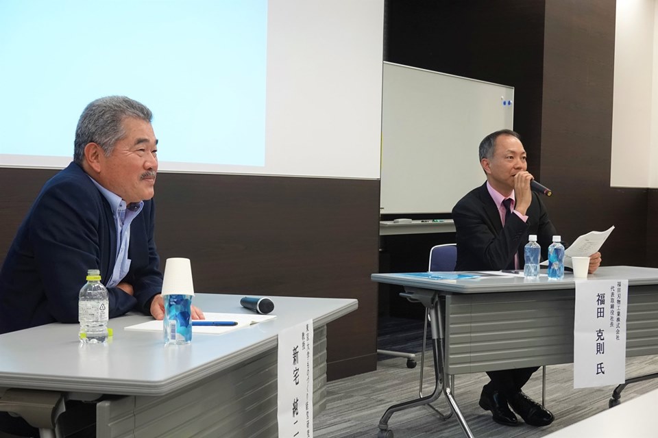 高収益を生み続けるメーカーとして福田刃物工業を選定、今回の講演に推薦していただいた東京大学の新宅教授。TTFH顧問の日下部さん、東海東京証券の久保さん、TTFHの石田CEOと役員のみなさま。出席された企業の経営者やリーダー、大学教授、学生のみなさま。応援に駆けつけてくれた山下さん、矢永さん。そして、言わなくてもテキパキ動いてくれる入社2年目の塚原さん。